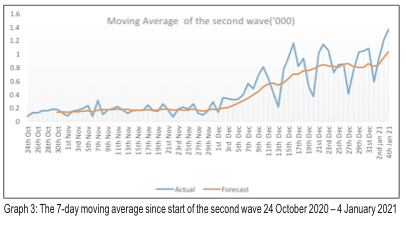In the first wave, the moving average followed an inverted U-shape pattern that rose slowly to the peak with a continuous decline until it ended. However, the seven-day moving average in the second wave follows a zig-zag pattern as the number of cases in the last month of 2020 increased faster, specifically from December 13, 2002, to January 1, 2021.