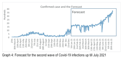 Our forecast reveals that the peak of the second wave is at least six months away. Though we expect fluctuation in the daily confirmed number of cases, the data is clearly trending upwards, both from the evidence of the seven-day moving average and the seasonal forecast.