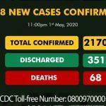 As at 11pm 1st of May, Nigeria has a total confirmed 2,170 people infected with the novel coronavirus; 351 have been discharged and 68 have died.