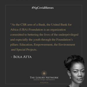 The next organisation under the spotlight is UBA Foundation. The Foundation was the first by a bank in Nigeria, and since inception in 2005, it has impacted hundreds of thousands of lives across the continent through various special projects carried out in various host communities. The CEO of the UBA Foundation is Mrs Bola Atta. Bola is also Group Director, Corporate Communications at UBA PLC.