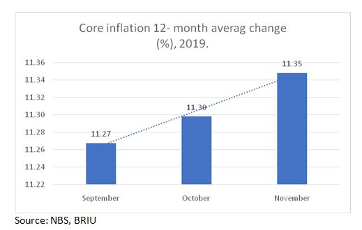 Core inflation is the change in the costs of goods and services but does not include those from the food and energy sectors. That is, it excludes the prices of volatile agricultural produce. During the reference period, the variable stood at 8.99 percent in November 2019, an increase of 0.11 percent when compared with 8.88 percent recorded in October 2019.
