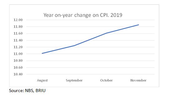 The report also shows that the percentage change in the average composite CPI for the twelve-month period ending November 2019 over the average of the CPI for the previous twelve-month period was 11.35 percent, representing a 0.05 percent point from 11.30 percent recorded in October 2019.