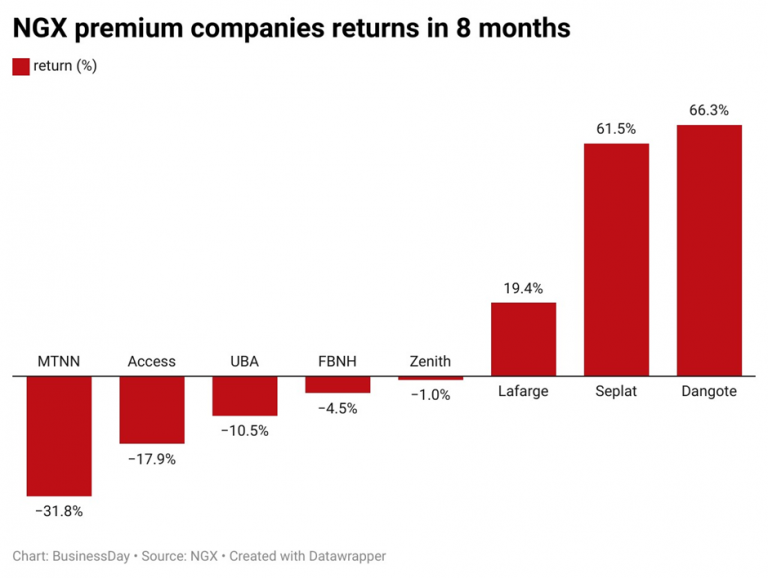 The NGX Premium companies are Access Holdings Plc, Dangote Cement Plc, FBN Holdings Plc, United Bank for Africa Plc, Lafarge Africa Plc, Zenith Bank Plc, MTNN Plc and Seplat Energy Plc.