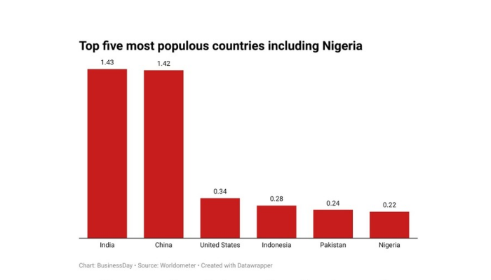 India and China lead the chart with 1.43 and 1.42 billion people, respectively, followed by the United States with 0.339 billion. Indonesia, Pakistan, and Nigeria complete the list, with populations ranging from 0.223 to 0.277 billion, showcasing global demographic diversity and distribution.