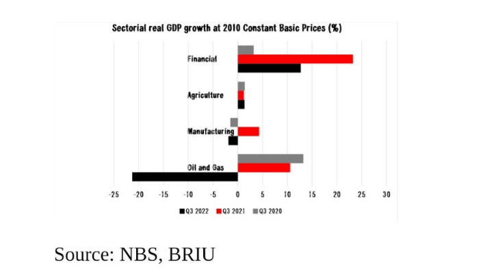 The sector contributed 29.67 percent to overall GDP in real terms in Q3 2022, lower than the contribution in the third quarter of 2021 and higher than the second quarter of 2022 which stood at 29.94 percent and 23.24 percent respectively