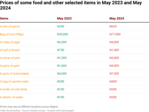 A derica of beans has surged from N500 to N1,300, and a 25-litre container of vegetable oil is now priced at N45,000. A paint of garri now priced N4,000 from N1,000 in May 2023.