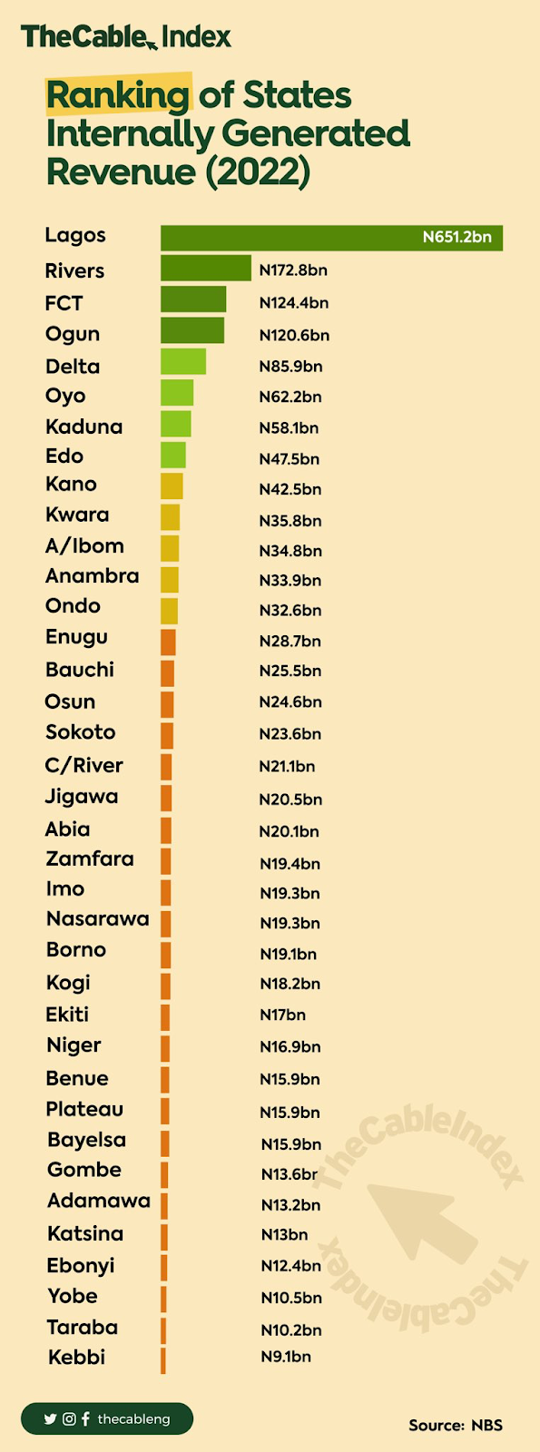 According to the NBS, Lagos State, Rivers State and the FCT generated the highest revenue of the states with N651.15 billion, N172.82 billion and N124.37 billion respectively in 2022.