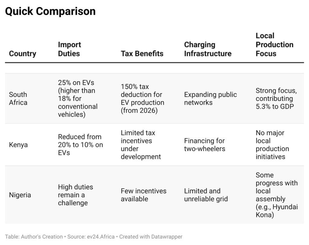 The table shows Nigeria trailing on every front: high import duties persist, few tax incentives exist, public charging is sparse, the grid is unreliable, and local production is limited to small assembly projects.