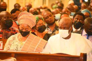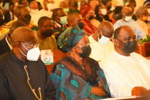 Babajide Sanwo-Olu, governor, Lagos State; Goodluck Jonathan, former president of Nigeria, and Victoria Gowan, wife of former head of state.