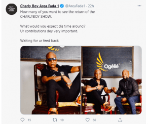 “How many of you want to see the return of the CHARLYBOY SHOW?” Charly Boy tweeted on April 26 via his verified handle @AreaFada1.