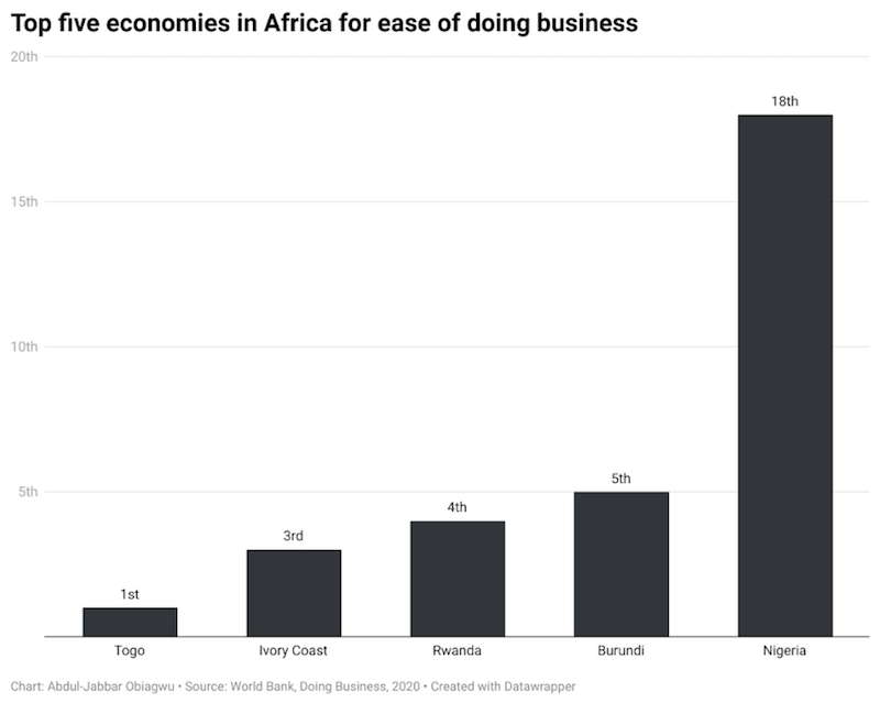 The World Bank in its 2020 Ease of Doing Business report ranked Nigeria 131 out of 190 countries surveyed. According to the Bank, an entrepreneur in a low-income economy like Nigeria typically spends around 50 percent of the country’s per-capita income to launch a company, compared with just 4.2 percent for an entrepreneur in a high-income economy.