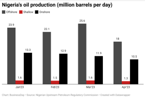 According to data from the Nigerian Upstream Petroleum Regulatory Commission (NUPRC), Nigeria’s total oil output from January to April averaged 22.4 million barrels from offshore, 12.2 million from onshore, and 1.5 million from shallow water.