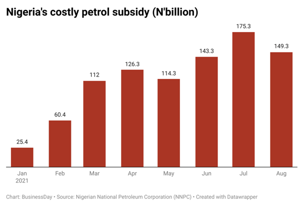 The Federal Government spent an estimated N149.28 billion subsidising petrol in August, an increase of 488 percent compared with the N25.37 billion spent in January.