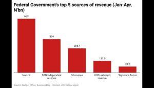 Revenue earned by the government from January to April was N1.6 trillion, consisting N633 billion from non-oil revenues, N394 billion from Federal Government independent revenue, N285.4 billion from oil revenue, N137.5 billion from GOEs retained revenues, and N70 billion from the signature bonus.