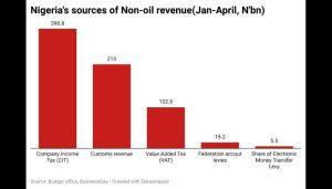 Nigeria’s non-oil revenue consists of N298.8 billion from company income tax, N210 billion from N210 billion, N102.9 billion from Value Added Tax, N15.2 billion from federation account levies, and N5.5 billion from share of electronic money transfer levy.