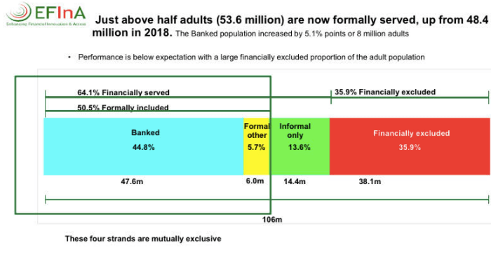 This means that 36 percent of Nigerian adults, or 38.1 million of the country’s 106 million (18 years and above) adults, remain completely financially excluded. This is a shortfall by 16 percent points from the desired target of a 20 percent exclusion rate.
