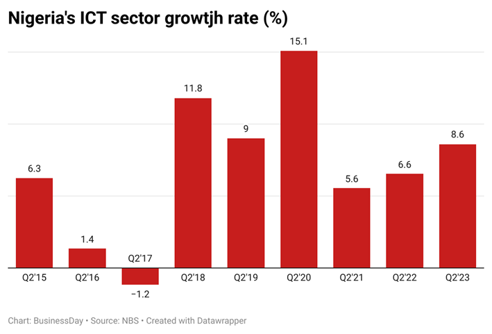 Nigeria’s Information and Communication Technology (ICT) sector in real terms grew by 8.6 percent (year-on-year) in the second quarter of 2023, the highest growth rate in three years.