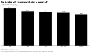 According to the index, Imo, Abia, Lagos, Cross River, and Anambra states contributed the highest percentage to overall MPI in terms of food insecurity.