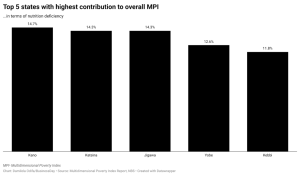 In terms of nutrition deprivation, the five states with the highest contributions to the MPI are Kano, Katsina, Jigawa, Yobe, and Kebbi.