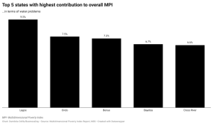 Lagos, Ondo, Benue, Bayelsa, and Cross River topped the list of states that have water problems, contributing the highest percentages to the overall MPI at 9.3 percent, 7.5 percent, 7.3 percent, 6.7 percent, and 6.6 percent respectively.