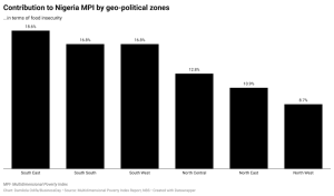The report also contains Nigeria MPI by zone. Of the six geopolitical zones in Nigeria, the South-East zone contributed the highest percentage (18.6 percent) to MPI in terms of food insecurity, while the North-West zone contributed the least (8.7 percent).