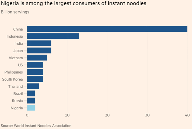 Nigeria is currently among the largest consumers of instant noodles, according to figures from the World Instant Noodles Association, with 1.92million servings as of May 2020, the country occupies 11th position in the global demand for noodles ranking.