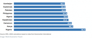 According to a report by the World Economic Forum WEF, Nigeria tops the list of nine countries in the world that spend over 40percent of household income on food. Four of them are in Africa: Nigeria 56.4percent; Kenya 46.7percent; Cameroon 45.6percent; and Algeria 42.5percent. Four are in Asia: Kazakhstan 43.0percent; Philippines 41.9percent; Pakistan 40.9percent; and Azerbaijan 40.1percent. Guatemala is the only South American country to appear in the list and spends 40.6percent of its household income on food.