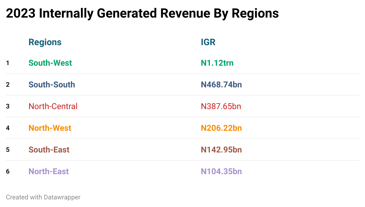The Internally Generated Revenue of South West states combined has topped the list of IGRs by geopolitical zones in Nigeria for 2023. The South-West generated a total of N1.12trn.