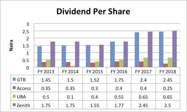 Zenith Bank which delivered the second highest return, albeit a single digit growth in the half-decade period has a dividend per share of N2.5 for the 2018 full year compared to N1.75 paid in 2013.