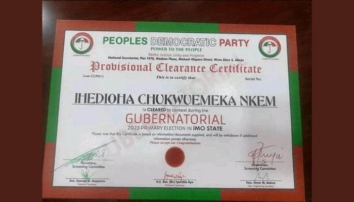 The Peoples Democratic Party (PDP) has certified Emeka Ihedioha, immediate past governor of Imo State, suitable to contest the 2023 Imo State PDP governorship primary election.