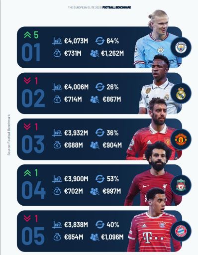 The English team accomplished this milestone after an amazing rise that began with the Abu Dhabi United Group’s acquisition in 2008. The Citizens climbed the ranking, gaining five positions since the 2022 edition, owing principally to the exceptional financial performance recorded in the 2021/22 fiscal year, which had the highest revenue.