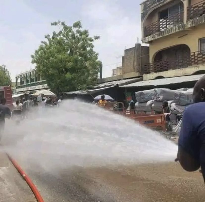 Photos surfaced online showing men of the Borno State Fire Service spraying cool water within the Market on Monday and also in surrounding areas to alleviate the effect of the heat.