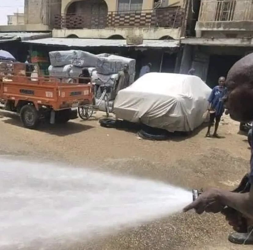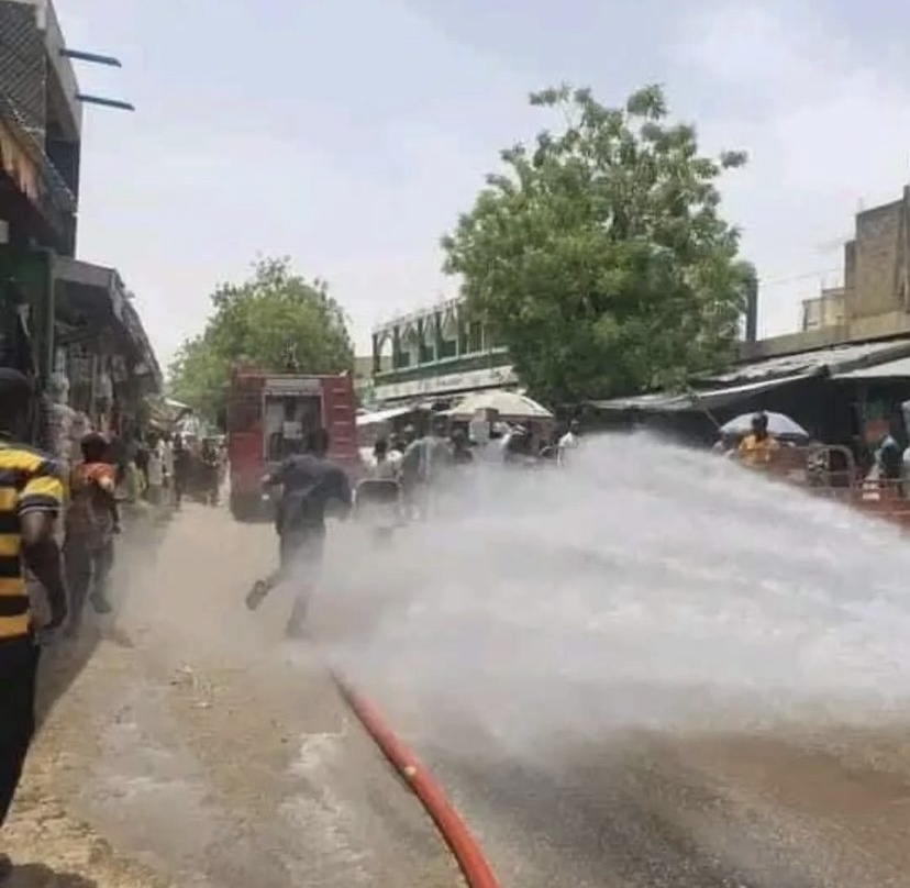 Photos surfaced online showing men of the Borno State Fire Service spraying cool water within the Market on Monday and also in surrounding areas to alleviate the effect of the heat.