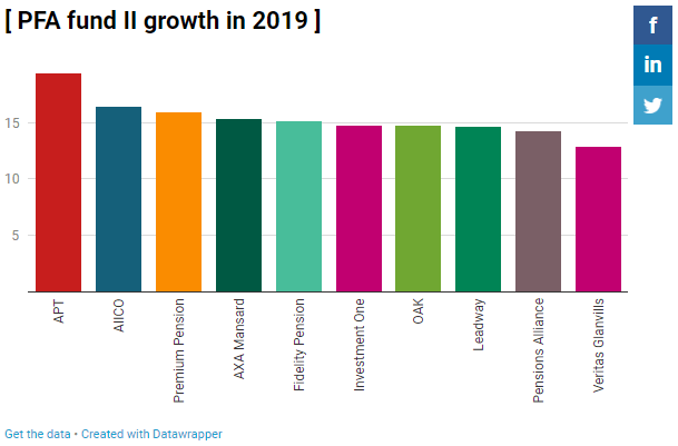 APT Pension, AIICO Pension, Premium Pension, AXA Mansard, Fidelity Pension and seven others beat annual inflation in 2019 to emerge best performing Pension Fund Administrators in Fund II, Nigeria’s biggest total Retirement Savings Account (RSA) Fund.