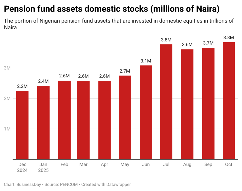 According to industry analysts, this performance was not an accident. Over the years, Pension Fund Administrators (PFAs) have aggressively rebalanced portfolios into stocks. At the start of 2024, about 8.6 percent of pension fund assets were in Nigerian equities. By the end of 2024, the figure went up to 9.9 percent. As of October 2025, domestic equities made up 14.4 percent of pension fund assets.