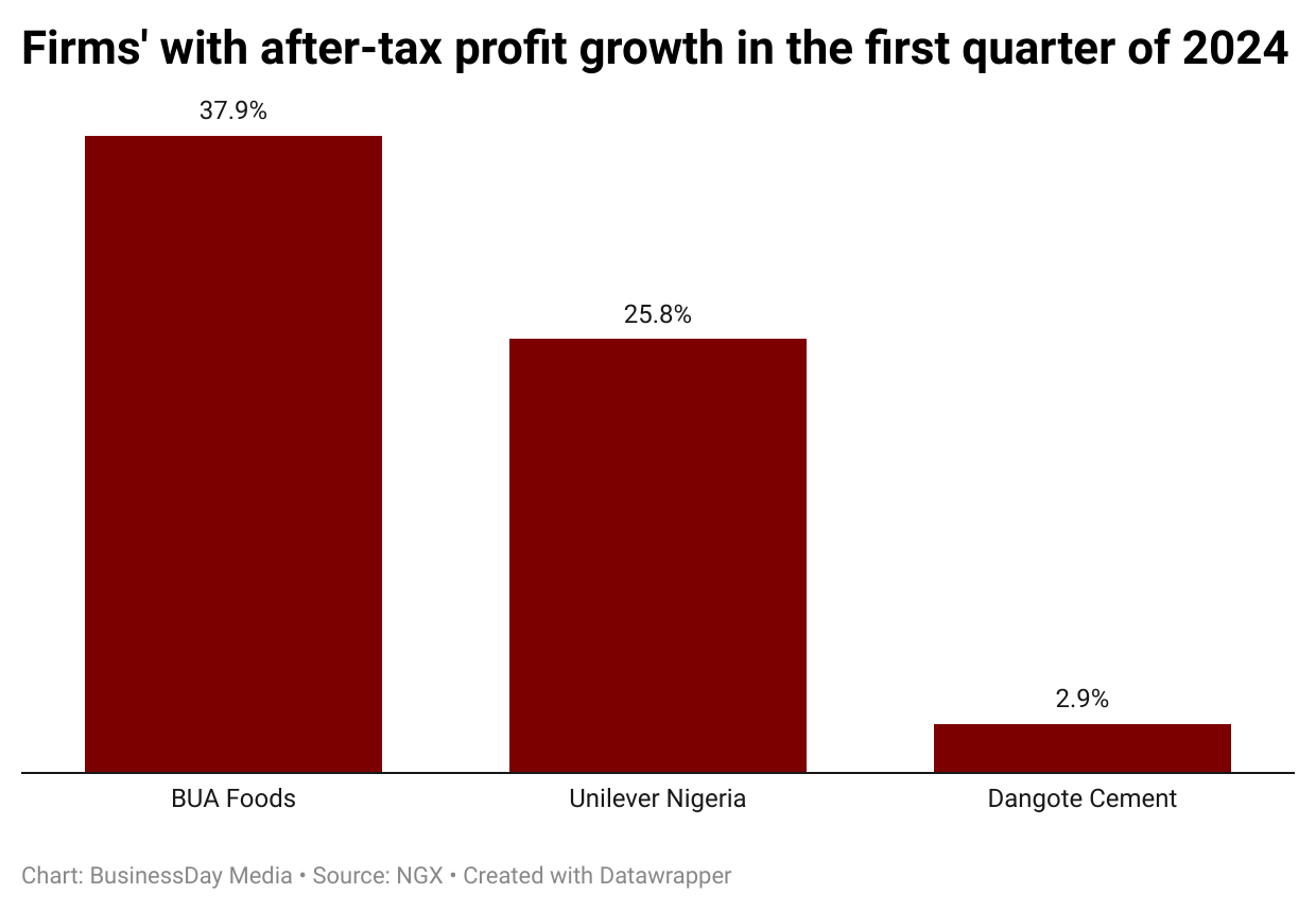 BUA Foods Plc, Unilever Nigeria Plc, and Dangote Cement Plc recorded an increase in their earnings in the first quarter of 2024 despite the mounting economic headwinds that dampened the production capacity of many businesses making them incur huge losses.