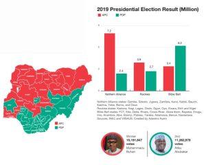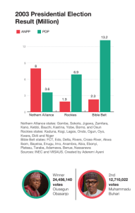 The Bible Belt and Rockies went to the PDP, helping Obasanjo to a second term with 24.4 million votes, outperforming Buhari who came second with 12.7 million votes.