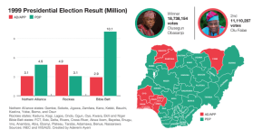 Ejobe told BusinessDay that the 1999 election data analysis is interesting because even though it looked like it was a PDP white-wash that year, it was purely a representation of certain trends that have already started to occur, some of which may never change.
