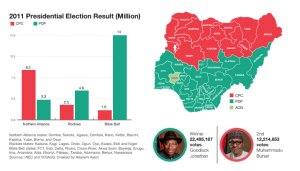 The 2011 election painted a picture of the established and growing Northern Alliance bloc. Again, the Northern Alliance, with the exception of Osun state, would vote for President Buhari who was representing the Congress for Progressive Change (CPC) this time. It would however be the PDP’s Goodluck Jonathan, who captured the Bible Belt (which by now were established loyalists of the PDP) and the Rockies, that would emerge