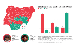The 2015 election saw a repeat of the trend where the Northern Alliance voted for Buhari. The loyalty of the Bible Belt states to the PDP waxed stronger with victory for the PDP’s Jonathan yet again. The Rockies can be said to have been formed here as the West broke free from the Bible Belt and voted for a different party.