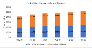 Another staple that is quite affordable for a low-income earner in Nigeria is garri. The cost of garri was not in any way exempted from the inflationary trend. Yellow garri was observed to be more expensive than white garri. However, the price of both white and yellow garri had increased by 50.82 per cent and 56.3 per cent respectively in October 202o compared to the same month last year, while it increased by 3.90 per cent and 4.34 per cent month-on-month. This means that the naira value that can buy a bag of garri last year can only purchase half a bag in October 2020.