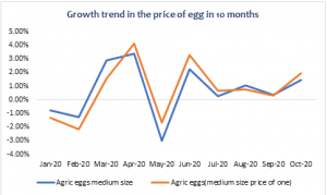 Price inflation was also reflected in food products from livestock. However, it was at a fair rate for agric eggs—medium size and medium size price of one. Since January 2020, the price of agric egg medium size was at an average of N469.72, while the price of an egg was at an average of N41.58 in 10 months. In October 2020, the price of agric eggs medium size was N487.82 while the price of an egg was N43.72. The price represents a YoY and MoM growth of 5.48 per cent and 1.47 percent (medium size) respectively and 7.92 per cent and 1.92 per cent respectively.