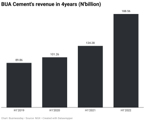 The cement manufacturer also reported an increase in revenue by 51.7 percent to N188.56 billion in the first half of 2022 from N124.28 billion in the corresponding period of 2021.