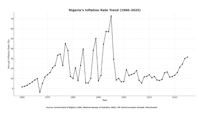 The volatility of the naira is far from a new phenomenon. Its origins can be traced to the oil boom of the 1970s. Prior to that, inflation in Nigeria remained relatively modest. In 1966, however, it surged to 10%, marking Nigeria’s first instance of double-digit inflation. The following year, in 1967, the country recorded deflation, with the annual rate dropping to -3.73%. Over the next decade, this was followed by a sharp inflationary spike fuelled by an influx of oil revenue and unchecked government spending, which flooded the economy with excess liquidity that it lacked the production capacity to absorb—ultimately laying the groundwork for chronic inflation.