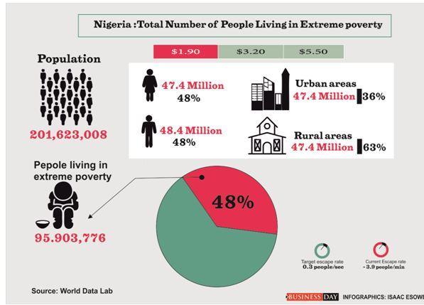 About 399.5 million people globally live in extreme poverty and 16 per cent of the global population in extreme poverty lives in Nigeria. Across Nigeria, 95.9 million people live in extreme poverty, that is, people living below the poverty line of $1.90 per day. This, however, represents 48 per cent of the Nigerian population according to the World Poverty Clock as of 3rd of March, 2020.