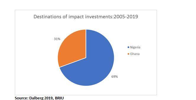 On average, 69 percent of the total impact investments or $6.73 billion went into the Nigerian economy while 31 percent or $2.96 billion went into the Ghanaian economy between 2005 and 2019.