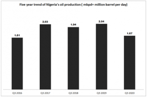 NBS data revealed Q3 oil production of 1.67 million barrels per day (Mbpd) was the lowest since Q32016. Q3 oil production was 0.37 mbpd lower than the average production recorded in the same quarter of 2019 and 0.14mbpd lower than production volume recorded in the second quarter of 2020.