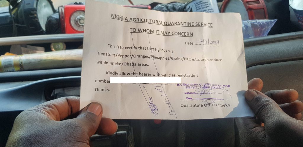 After exchanging pleasantries and briefing them on the purpose of the visit, Abdulateef Otolorin, the Babaloja of Imeko, who also introduces himself as a chief, was the first to speak. Like the king, he also said all was well, and that the extortions were a thing of the past. He went further to explain that as part of efforts to address the issue, a document was being provided by the Nigerian Agricultural Quarantine Service (NAQS), which farmers or traders moving agricultural goods would show at checkpoints. Made available to each person at the cost of N2,500 (in Imeko), this document was supposed to be a magic wand – wave it at security agents at any checkpoint and they would grant passage.