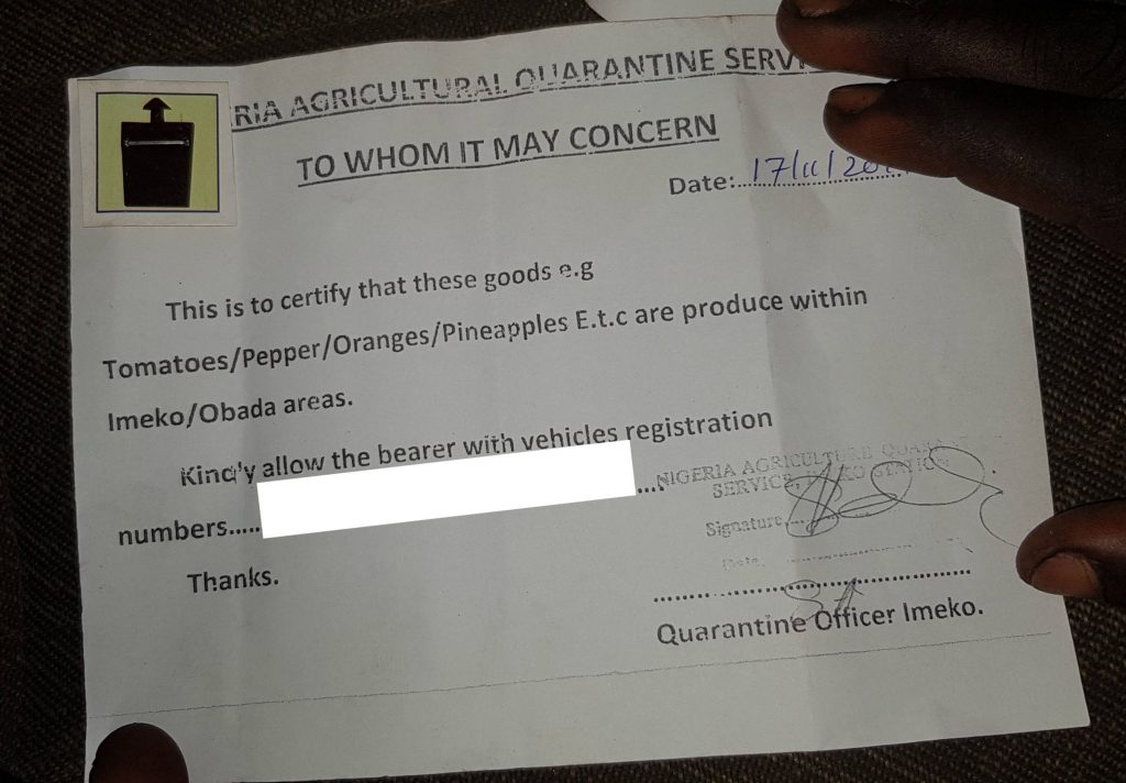 The document, seen by this reporter, reads: “This is to certify that these goods e.g Tomatoes/Pepper/Pineapples/Grains/PKC etc are produce (sic) within Imeko/Obada areas. Kindly allow the bearer with vehicle registration numbers……….”
