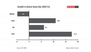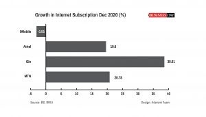 The all-round positive growth explained the good runs telecoms companies had in 2020. MTN Nigeria got 12 million additional active lines in 2020. Airtel Africa got 5.45 million additional lines while Globacom Nigeria got 3.14 million extra lines. MTN Nigeria topped the telecoms’ growth chart as its active lines increased to 80.76 million in 2020 up from 68.76 million in the previous year. Airtel Africa witnessed a 10.9 percent growth in 2020 with 55.64 million active lines up from 50.19 million in 2019. Globacom recorded 6.1 percent growth as its internet subscriptions rose from 51.7 million active lines in 2019 to 54.8 million lines in 2020.